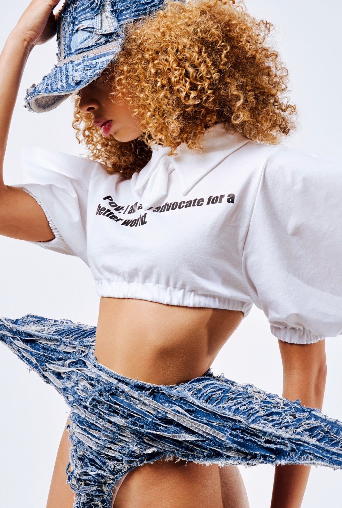 Our twist of the average cotton tee with our signature strong shoulder form, office details, and pov. message. Pairs easily with any denim bottoms!